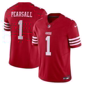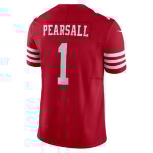 Step up in innovation with the Ricky Pearsall San Francisco 49ers Scarlet Vapor F.U.S.E Limited Jersey – All Stitched. This Vapor F.U.S.E Limited edition is featuring a “standard fit,” Dri-FIT technology, heat-transferred twill name and numbers, and a chainmaille mesh grill at the collar. Stitched Ricky Pearsall name and number with embroidered San Francisco 49ers patch and logo showcase bold SF pride.