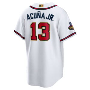 This Ronald Acuna Jr Atlanta Braves White 2022 Gold Program Jersey – All Stitched is an essential piece of gear for any Atlanta Braves fan looking to highlight their favorite jersey and player. The Ronald Acuna Jr Atlanta Braves White 2022 Gold Program Jersey and team details provide a kickoff-ready look that elevates your excitement for game day. Made with comfort in mind, this Atlanta Braves jersey delivers a standard, lightweight fit and features breathable mesh side panels for added ventilation.