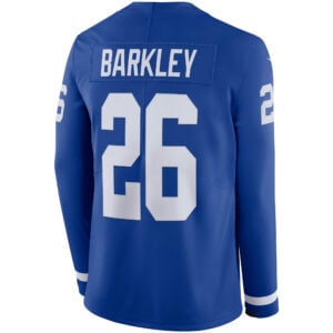 Experience the pride of New York with this New York Giants Royal Therma Long Sleeve Jersey featuring Saquon Barkley. Designed for devoted fans of the Giants and their iconic NY spirit, this long-sleeve piece highlights crisp stitched name and number that stand out boldly against the royal base. The Giants logo is carefully embroidered, giving it a strong, premium look that celebrates the team’s deep roots and state pride. Perfect for cooler weather, the Therma fabric adds comfort while showing off your dedication to the Giants. Whether you’re repping the G-Men at MetLife Stadium or watching from home, this jersey brings classic New York football energy to your wardrobe.