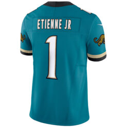 Connect past and present with the Travis Etienne Jacksonville Jaguars Teal Prowler Throwback Vapor F.U.S.E Limited Jersey – All Stitched. This Limited version enhances the Prowler throwback look with a standard fit, Dri-FIT comfort, heat-transferred twill details, and chainmaille mesh collar construction. Finished with stitched Etienne name and number, embroidered Jaguars logos, and patches, it’s a must-have for fans who honor both Florida history and Jaguars innovation.