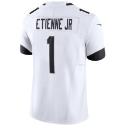 Travel the distance in the Travis Etienne Jacksonville Jaguars White Road Vapor F.U.S.E Limited Jersey – All Stitched. This Limited edition includes standard fit tailoring, Dri-FIT fabric, heat-transferred twill accents, and a chainmaille mesh grill collar. With stitched Etienne details, embroidered Jaguars patches, and logos that represent Florida pride, this jersey is perfect for road-game intensity.