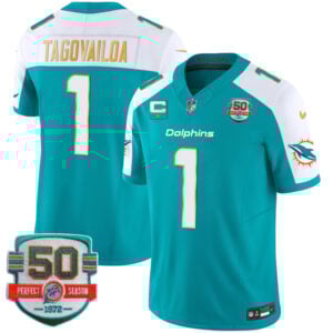 Tua Tagovailoa Miami Dolphins Alternate Aqua “Gold Trim” Vapor F.U.S.E Limited Jersey – All Stitched
