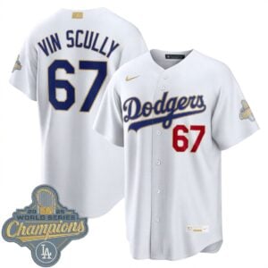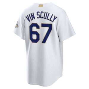 Celebrate the legacy of the Blue Crew with the Vin Scully Los Angeles Dodgers White 2026 Gold Collection Jersey. This all-stitched piece honors the legendary broadcaster who served as the voice of the team for over sixty years, earning his place in the Hall of Fame. Featuring high-quality embroidery and a sleek design, this Gold Collection Jersey captures the classic spirit of the game. It is built for lasting comfort, ensuring you look your best at the stadium or home. Our reputation for quality is satisfied by thousands of customers who value premium apparel. This jersey is perfect to buy for your love of the team or as a great gift.